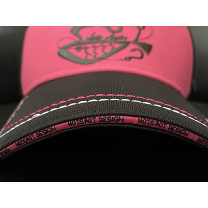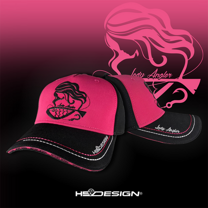 Visiera: scritta Lady Angler e logo Hotspot Design ricamati, due grandi linee di cucitura in colore bianco e rosa, sandwich in contrasto colore con logo Hotspot Design stampato su tutta la lunghezza.
