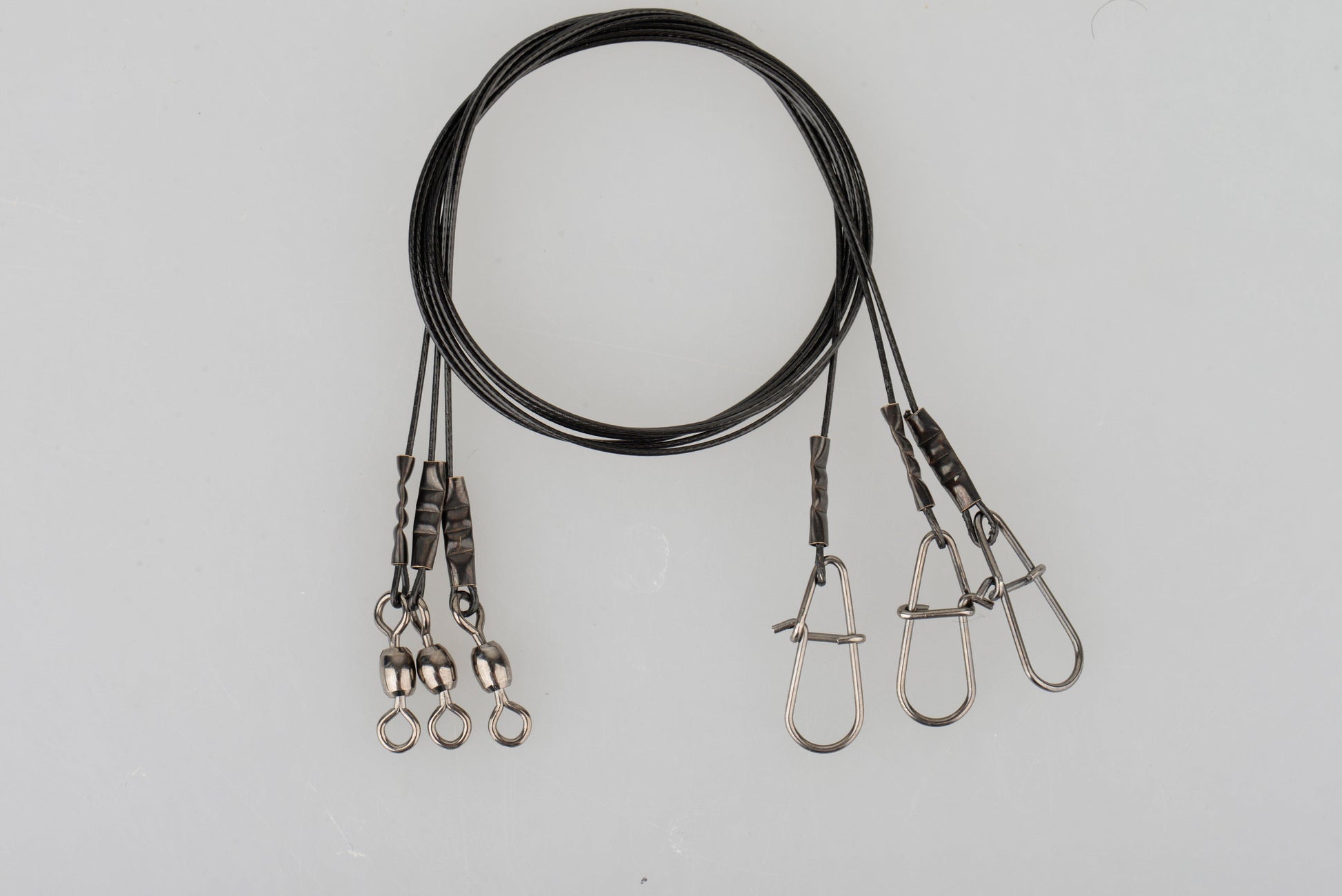 Fio de aço inoxidável de sete fios ultra-forte, revestido com um copolímero preto forte, para excelente resistência à abrasão. Giro de tamanho perfeito e encaixe de agulha de aço com mola, para iscas duras ou macias. Um rastreamento de lúcio ideal.