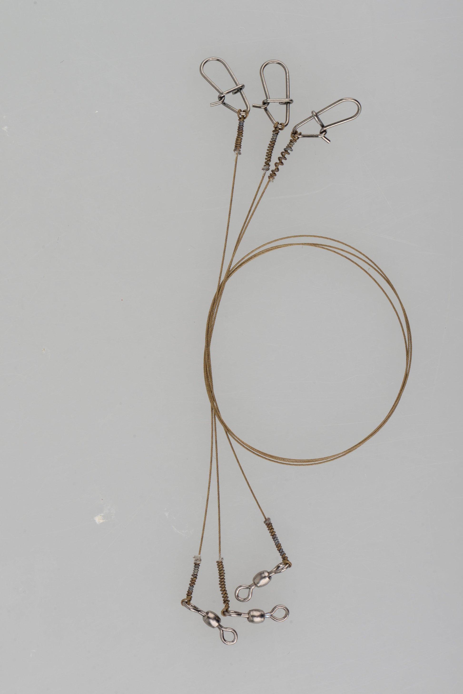 Sârmă de oțel carbon ultrafină și moale, neacoperită, împletită la fiecare capăt pentru prezentarea cu finețe a nalucilor mici, dure și moi.